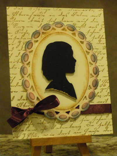 I love cameo silhouettes. I can imagine a Victorian home with a silhouette done in black paper and hanging on a wall in a gilded frame. The Cricut cartridge Heritage has a number of these cameos that can be cut out in pretty much any size you want. I wanted to use these and thought about making some cameo cards.